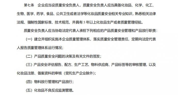 《规范》指出,企业法定代表人应对化妆品质量安全工作全面负责,合理制定并组织实施质量方针,确保实现质量目标;质量安全负责人应当具备化妆品、化学、化工、生物、医学、药学、食品、公共卫生或者法学等化妆品质量安全相关专业知识,熟悉相关法律法规、强制性国家标准、技术规范,并具有5年以上化妆品生产或者质量管理经验。