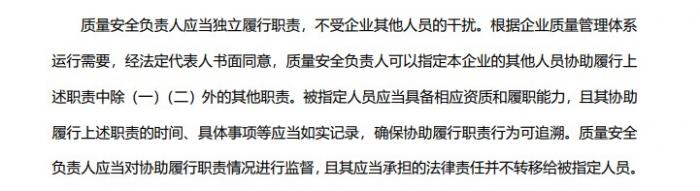 针对自征集意见稿发布以来便备受关注的“质量安全负责人”一项,《规范》中也明确给出了相应的解释,规定了质量安全负责人的遴选标准、产品质量安全管理职责、产品放行职责。