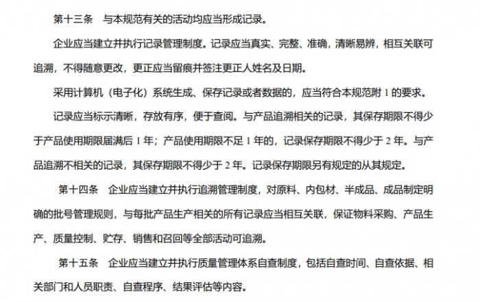 21世纪经济报道记者还注意到,在《规范》第三章“质量保证与控制”中,对执行记录管理制度进行了详细陈述:“企业应当建立并执行记录管理制度,且记录应当真实、完整、准确,清晰易辨,相互关联可追溯,不得随意更改,更正应当留痕并签注更正人姓名及日期。”不仅如此,《规范》还明确指出,与产品追溯相关的记录,其保存期限不得少于产品使用期限届满后1年;产品使用期限不足1年的,记录保存期限不得少于2年。与产品追溯不相关的记录,其保存期限不得少于2年。