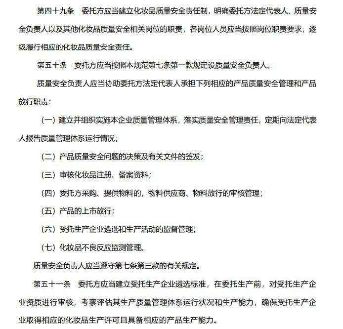 此外,记者还注意到,《规范》还要求质量安全负责人应当协助委托方法定代表人承担相应的产品质量安全管理和产品放行职责,当中就包括了:受托生产企业遴选和生产活动的监督管理;化妆品不良反应监测管理。《规范》同时指出,“委托方应当建立并执行受托生产企业更换制度,发现受托生产企业的生产条件、生产能力发生变化,不再满足委托生产需要的,应当及时停止委托,根据生产需要更换受托生产企业。”