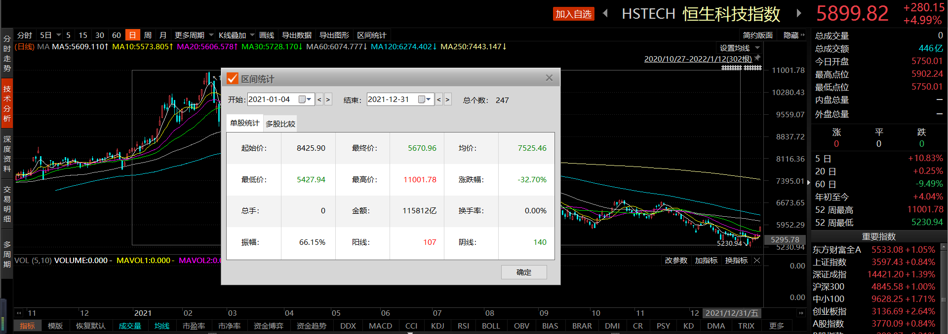 据东方财富Choice数据,去年年初至年末的247个交易日里,恒生科技指数累计大跌32.7%,下跌的交易日则达140个,约占去年总交易日数的57%。