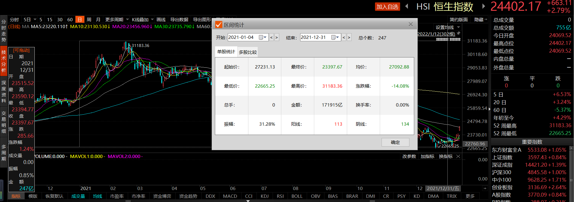 据东方财富Choice数据,去年年初至年末的247个交易日里,恒生指数累计下跌14.08%,下跌的交易日达134个,超过总交易日数的一半。