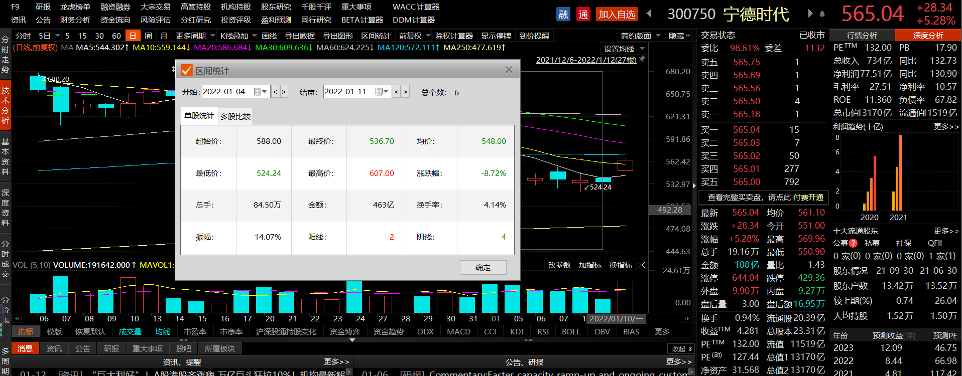 截至1月12日收盘,新能源板块收涨1.57%,新能源车板块收涨2.12%。宁德时代则大涨5.28%,收盘报价565.04元/股,最新市值13170亿元,成交额超百亿。值得一提的是,在新年的前6个交易日内,宁德时代已累计下跌8.72%,总市值蒸发超千亿。