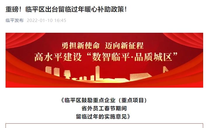 杭州临平区发布《临平区鼓励重点企业(重点项目)省外员工春节期间留临过年的实施意见》,提出向符合条件的非浙江户籍员工发放1000元/人的现金补助。