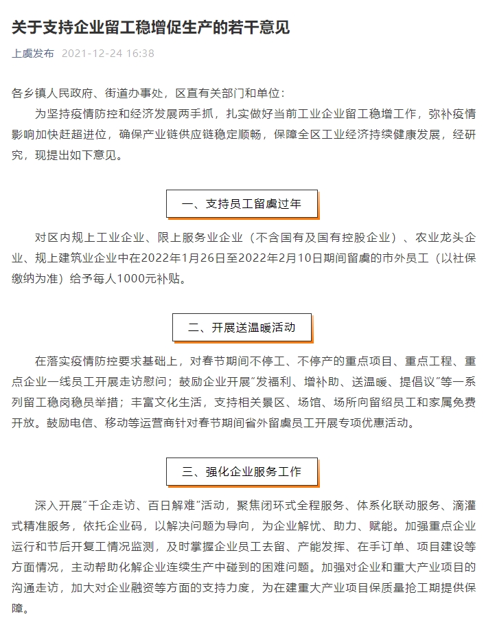上虞区发布《关于支持企业留工稳增促生产的若干意见》。意见中指出,对区内规上工业企业、限上服务业企业(不含国有及国有控股企业)、农业龙头企业、规上建筑业企业中在2022年1月26日至2022年2月10日期间留虞的市外员工(以社保缴纳为准)给予每人1000元补贴。