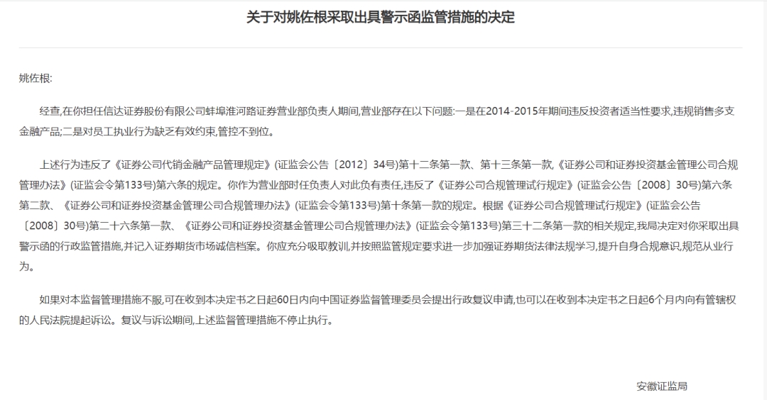 安徽证监局决定对姚佐根采取出具警示函的行政监管措施,并记入证券期货市场诚信档案。
