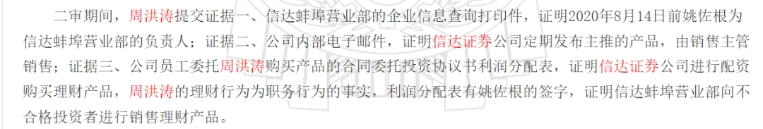 而在魏某某诉周某涛、蚌埠营业部、信达证券合同纠纷案中,周某涛向蚌埠中院提供了信达证券员工配资购买理财产品,以及2014年由时任营业部负责人姚佐根签字的“利润分配表”——以此来证明蚌埠营业部向不合格投资者销售理财产品的情况。