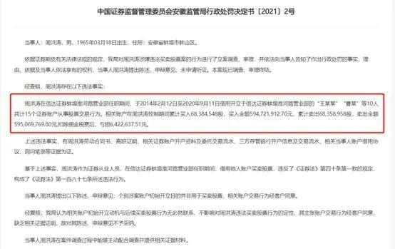 安徽证监局查明,周某涛在信达证券蚌埠淮河路营业部任职期间,于2014年2月12日至2020年9月11日借用“王某某”、“曹某”等10人共计15个证券账户从事股票交易行为。相关账户在周某涛控制期间累计买入6838.45万股,买入金额5.95亿元,累计卖出6835.9万股,卖出金额5.95亿元,扣除佣金税费后,亏损642.26万元。