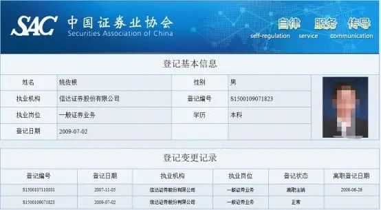 中国证券业协会网站显示,姚佐根于2007年11月5日在信达证券股份有限公司登记的执业岗位为一般证券业务,于2009年6月26日离职注销,后又于2009年7月2日在信达证券股份有限公司登记执业岗位为一般证券业务,目前的登记状态为正常。