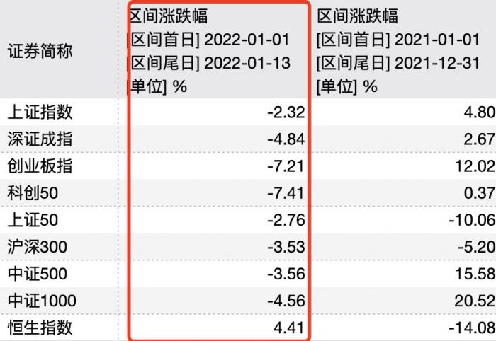 截至1月13日,今年以来8个交易日(下同),创业板跌了近7.21%,科创50跌了7.41%、深成指跌超4.84%、上证指数稍微好点,跌了2.32%。