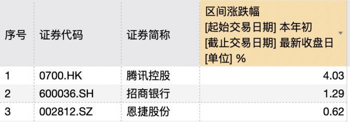 公募基金前20大重仓股,(2021年三季度数据),仅有3只上涨,分别为恩捷股份0.62%、招商银行1.29%、腾讯控股4.03%。