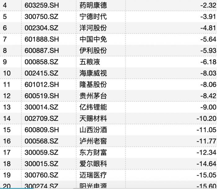 阳光电源-15.60%、迈瑞医疗-15.05%、爱尔眼科-14.64%、东方财富-12.34%、泸州老窖-11.77%、山西汾酒-11.05%、天赐材料-10.20%、亿纬锂能-9.00%、贵州茅台-8.42%、隆基股份-8.06%、海康威视-8.03%、五粮液-6.18%、伊利股份-5.93%、中国中免-5.64%、洋河股份-4.81%、宁德时代-3.91%、药明康德-2.32%。