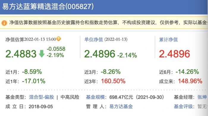 1月13日的净值估算显示,易方达蓝筹精选基金下跌2.19%,实际单位净值下跌2.14%,说明该基金基本重仓股没有太大的变动。