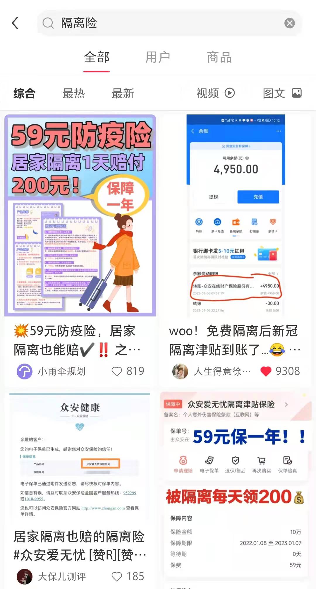 “59元防疫险,居家隔离1天能领200元,一杯奶茶钱保障一年!”“隔离就能赔钱的防疫险安利,旅游拜年出差必备!”“居家隔离也能领钱,这款隔离险真香!”……记者打开小红书APP发现,与“隔离险”相关的笔记有2500余篇。
