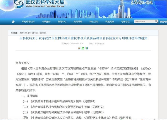 根据《市人民政府办公厅印发武汉市攻克制约重点产业发展“卡脖子”技术实施方案的通知》(武政办〔2021〕68号)精神,按照“成熟一个、启动一个”原则,经产业部门推荐、专家论证和集体研究等程序,武汉市科技局近日决定采取“揭榜挂帅”方式组织实施“生物育种关键技术攻关及新品种培育”专项项目(以下简称“生物育种专项”)。此次发布的榜单,包括《优质营养水稻种质创制与品种培育》《高产高效多抗适合机械化油菜新品种选育》《优质蔬菜精准育种关键技术与新品种创制》《生猪高效育种关键技术攻关与快长、高繁、优质种猪本土化选育》《长江中游特色鱼类精准育种关键技术攻关及新种质新品种创制》共5个,榜单金额分别为1500万、1000万、1000万、1500万、1000万。