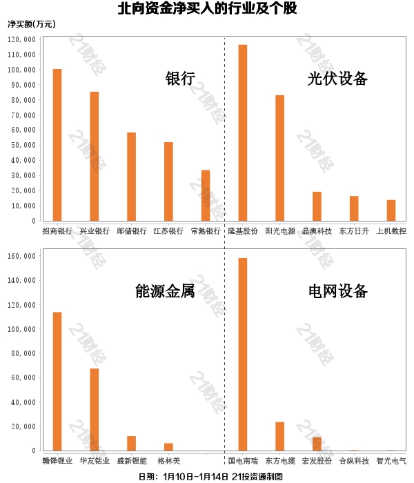 从行业来看,北向资金青睐银行、光伏设备等板块,一周净买入金额超10亿元的有国电南瑞、隆基股份、赣锋锂业等,净卖出东方财富、美的集团等超10亿元。