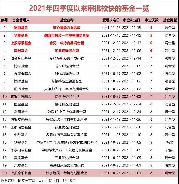 而近期获批的新基金中,最快的产品获批时间只有4天,招商核心竞争力混合基金于2021年11月16日获得受理,当年11月19日就已经获批,从受理到获准发行的天数仅仅用了4天。另外,专精特新主题基金、新能源主题ETF发起式联接基金等权益类基金,审查天数也在8天内就快速完成。