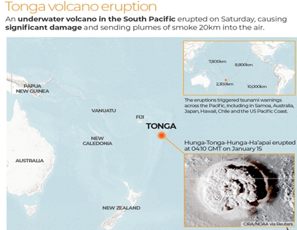 HungaTonga火山位于汤加福努阿福欧岛南东东方向约30公里处,处在太平洋板块与印度-澳大利亚板块俯冲边界上,是汤加-克尔马德克群岛火山弧的一部分,据Weather models估算,喷发高度至少25公里。本次火山爆发的强度很可能达到了VEI5级的上端,甚至有可能达到VEI6级,略低于1991年菲律宾皮纳图博火山喷发(VEI6级),强于2010年冰岛火山喷发(VEI2级)和2011年智利普耶韦火山喷发(VEI5级)。19世纪以来,VEI5级以上火爆爆发共11次,其中5级6次,6级4次,7级一次(详见下图)。