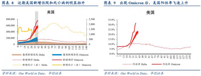 在奥密克戎已大面积传播的欧美等国,新增确诊、住院和重症病例增长速度均于快于德尔塔。1月11日,全美日新增确诊接近75万,远超前一轮疫情峰值17万,显示出奥密克戎强于Delta的传染性。