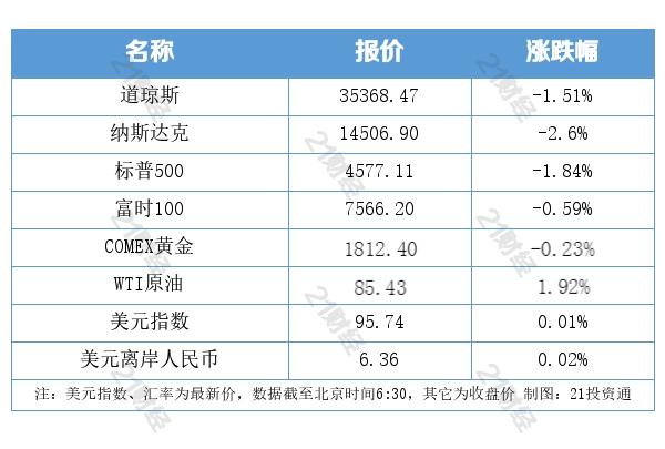 美国三大股指大幅收跌,高盛跌超7%,摩根大通跌超4%,领跌道指。美国国债收益率大幅攀升,令高成长科技股承压。科技股大跌,苹果跌近2%,微软跌超2%,脸书跌超4%。