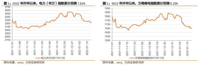 2022年开年以来,绿电板块持续回调。截至2022年1月14日,电力(申万)指数、万得绿电指数分别收盘于3227、1652点,较2021年12月31日分别下降 7.82%、9.23%。
