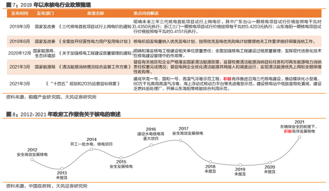 2021年政府文件首次提出“积极”发展核电。2012年福岛核事故后,中国逐步放缓了核电建设节奏。2021年,《“十四五”规划和2035年远景目标》和《2021年政府工作报告》先后提出“积极有序发展核电”。政策助力,中国核电有望在“十四五”期间迎来密集建设期。