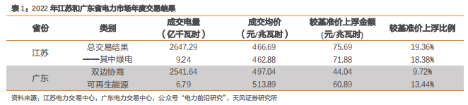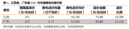 2022年区域电力市场年度交易结果落地,绿电溢价进一步抬升。2021年12月下旬,江苏省和广东省相继公布电力市场交易结果。其中,江苏省绿电成交电量为9.24亿千瓦时,成交均价为462.88元/兆瓦时,较当地燃煤基准价(391元/兆瓦时)溢价71.88元/兆瓦时;广东省绿电成交电量为6.79亿千瓦时,成交均价为513.89元/兆瓦时,较当地燃煤基准价(453元/兆瓦时)溢价60.89元/兆瓦时。