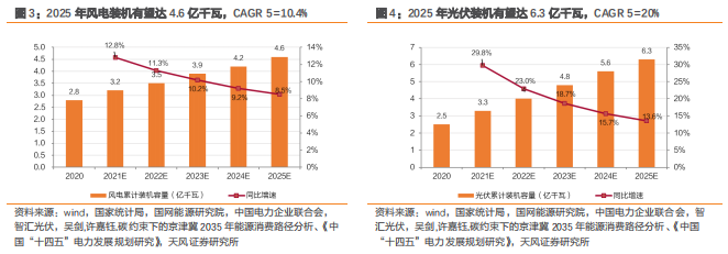 十四五期间新能源装机复合增长速度稳定。碳中和、碳达峰承诺下,电力部门深度脱碳是必经之路。我们预计风电累计装机规模将由2020年2.8亿千瓦提升至2025年4.6亿千瓦,2020-2025年CAGR达 10.4%;光伏累计装机规模将由2020年2.5亿千瓦提升至2025年6.3亿千瓦,2020-2025年CAGR达20%。