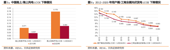装备制造业的降价红利向运营商转移。我国陆上/海上风电平均LCOE已由2010年0.071/0.178美元/千瓦下降至2020年的0.037/0.084美元/千瓦。用户侧/工商侧光伏发电LCOE分别由2012年0.164/0.148美元每千瓦时,下降至2020年0.063/0.060美元每千瓦时。展望未来,随着技术进步、规模化生产等带动建造成本的持续下降,叠加发电效率的提升,我国新能源发电成本有望进一步下降。上游装备制造业的降价红利将会向新能源运营商转移。