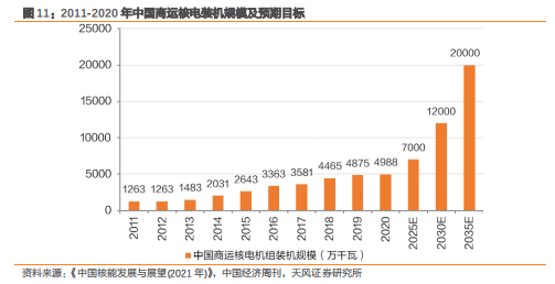 预计“十四五”期间中国年均核准6-8台自主三代核电机组。2020年中国商用核电装机4988万千瓦,在建装机1260万千瓦。根据中国核能行业协会及有关机构的研究成果,到2025年中国核电在运装机容量预计达7000万千瓦左右,在建装机规模接近4000万千瓦;到2035年,我国核电在运和在建装机容量将达2亿千瓦左右,发电量约占全国发电量的10%左右。按照华龙一号每台机组装机容量116-120万千瓦进行测算,中国市场在2035年前需新建100-150台核电机组,我们预计2021-2025年中国年均核准6-8台核电机组。