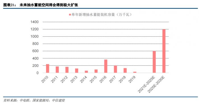 中信证券认为,从世界范围横向对比来看,我国抽蓄的配置比例处于严重不足的状况,其主要原因或在于过往对于抽水蓄能商业模式的不清晰带来的经济效益不足的问题。2021年5月,发改委发布的《进一步完善抽水蓄能价格形成机制的意见》直击抽水蓄能发展面临的市场化问题,为后续抽水蓄能的建设铺平道路。而伴随国家能源局于9月份发布的《抽水蓄能中长期发展规划》一同而来的是抽水蓄能建设空间的大幅扩张,中信建投证券预测在“十四五”和“十五五”的新增抽水蓄能年均投资规模达到200亿元和500亿元左右,中国电建作为在抽蓄市场拥有80%的龙头企业,或有望成为最大赢家。
