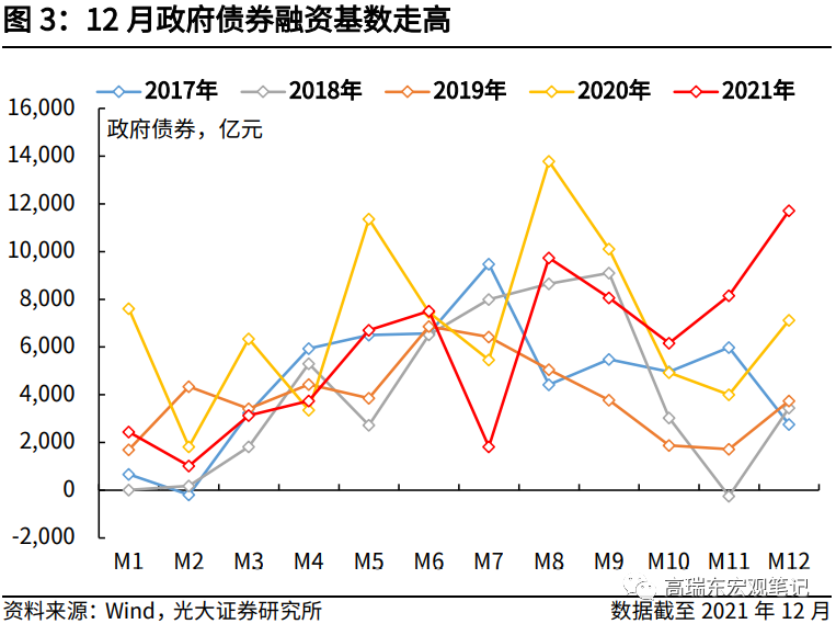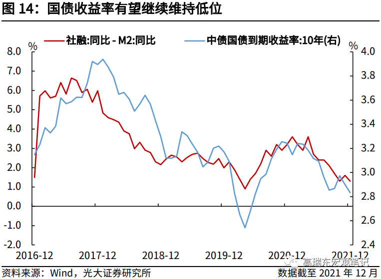 一是,由于2022年专项债部分新增额度已于2021年12月提前下达,预计2022年政府债券发行节奏将会整体前置,政府债券发行错位对新增社融的推动作用有望延续至2022年二季度初。