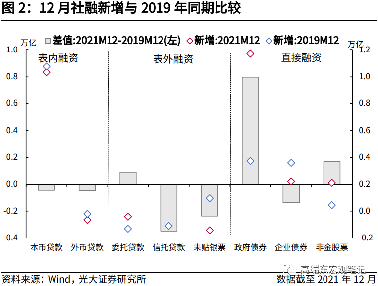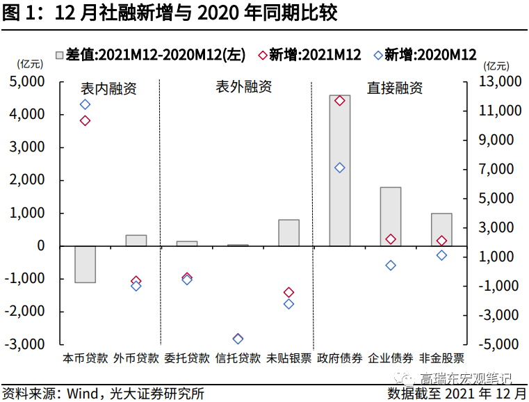 结构上来看,与2020年同期相比,12月表内融资少增779亿元,表外融资多增981亿元,直接融资多增7373亿元。与2019年同期相比,12月表内融资少增867亿元,表外融资少增4958亿元,直接融资多增8298亿元。