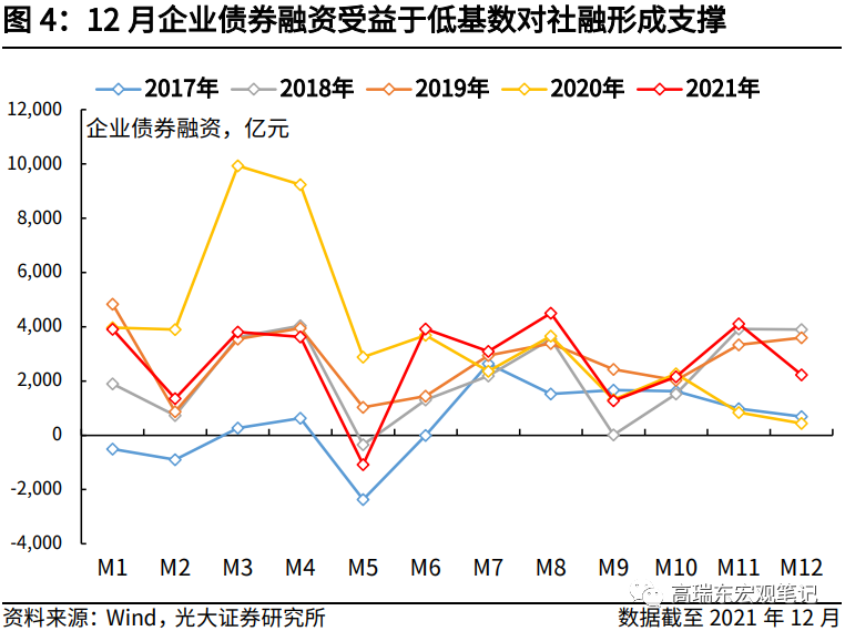 从数据层面来看,政府债券、企业债券以及非金融企业境内股票等直接融资,是12月新增社融的主要拉动项。其中,政府债券明显多增主要源于2021年专项债融资节奏整体滞后,而企业债券明显多增则主要源于2020年受永煤信用风险事件拖累所形成的低基数。