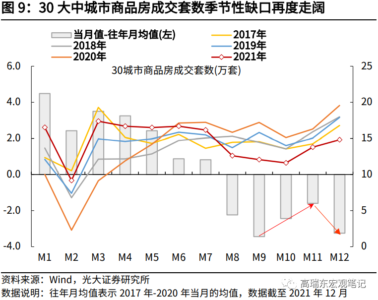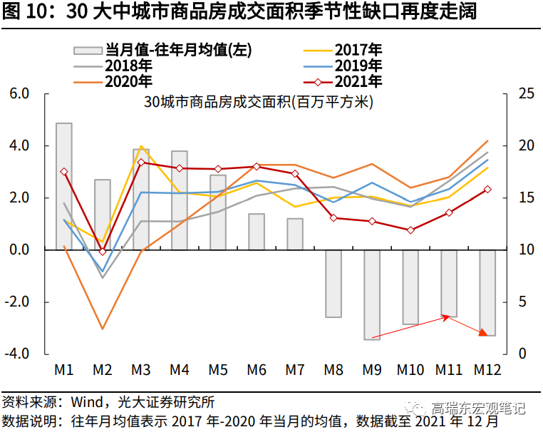 居民端来看,一方面,2021年8月份以来,多个地市商业银行对居民端的住房信贷有所放松,但由于强监管的影响仍未完全消除,叠加房地产销售数据仍未改善。因而,以个人住房按揭贷款为主的对私中长期贷款,虽然有所改善,但幅度有限。从30个大中城市的商品房销售数据来看,无论是销售套数,还是销售面积,12月的季节性缺口在连续两个月呈现收敛态势之后再度走阔。