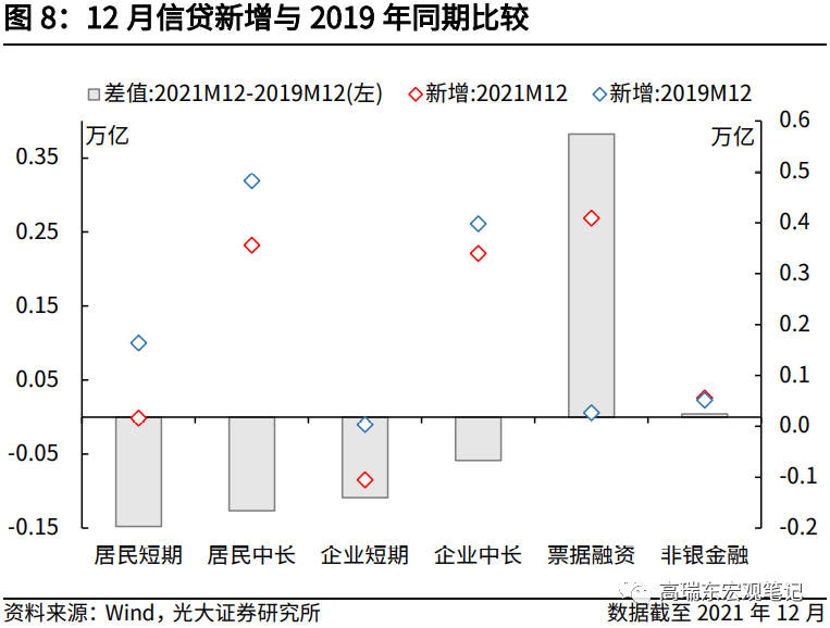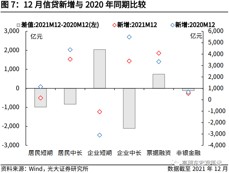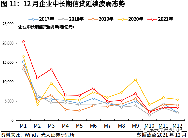 信贷结构有待改善,融资意愿持续低迷。总量上来看,新增信贷相较往年同期表现较为疲弱。12月新增信贷1.13万亿元,与2020年同期相比少增0.13万亿元,与2019年同期相比少增100亿元。