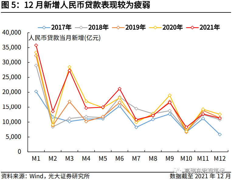 二是,为保持信贷处于合理增速区间,人民银行于2021年12月,先后下调金融机构存款准备金0.5个百分点,释放中长期资金约1.2万亿元;下调支农、支小再贷款利率5BP,进一步释放商业银行盈利空间;引导一年期LPR报价利率下调5BP,降低实体融资成本。在这一系列宽信用措施的引导下,2022年1月信贷开门红有望。