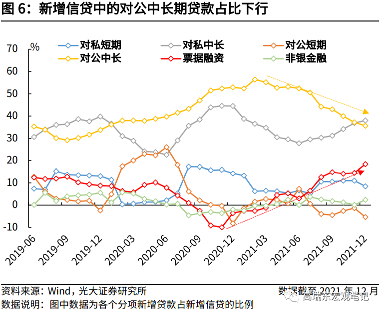 结构上来看,票据融资仍是主要的支撑项,企业贷款同比收缩态势并未改善。可以看到,2021年以来,新增对公中长期贷款占新增信贷的比例持续下行,而新增票据融资占新增信贷的比例趋势性上行。