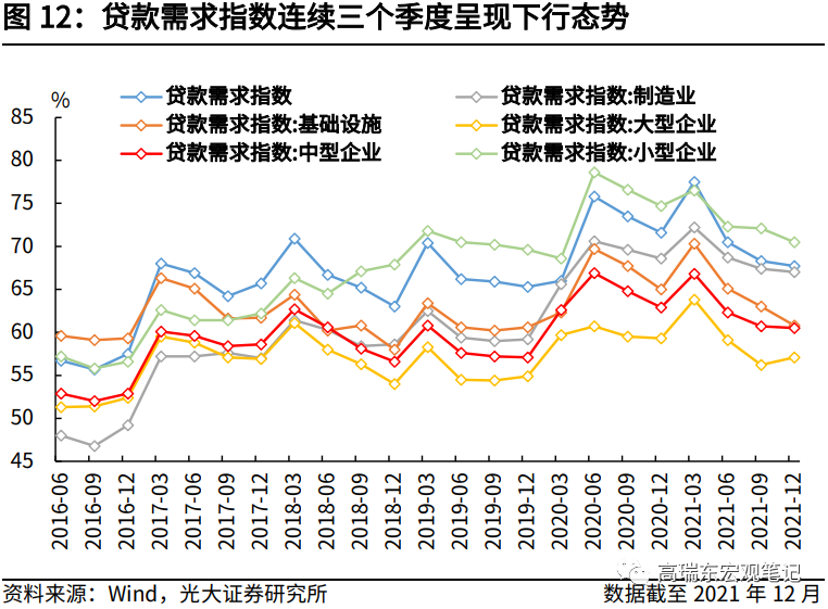 另一方面,7月以来,在疫情散发、限产限电、原材料涨价等多重因素扰动下,生产、消费、投资等宏观数据总体呈现出下行趋势,表征实体经济景气度的中采制造业PMI连续7个月处于边际下行态势,且9月和10月已经进入荣枯线以下的收缩区域。虽然11-12月制造业PMI有所修复,但推动因素主要源于供给端,需求端仍然较为疲弱。在实体经济增速面临较大趋缓压力的背景下,央行调查贷款需求指数连续三个季度呈现下行态势,表明企业信贷需求仍然处于边际放缓态势之中。