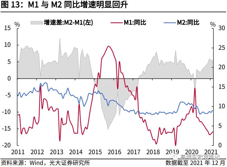 M1与M2同比增速双双回升,或受益于降准、下调1年期LPR利率后短期融资多增。12月M2同比增速为9.0%,M1同比增速为3.5%,均较11月上行0.5个百分点;M2与M1同比增速差,维持5.5个百分点不变。M1与M2同比增速呈现双双上行,或主要受益于人民银行降准、下调1年期LPR报价利率等一系列宽信用措施。