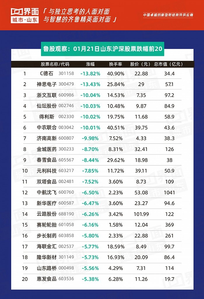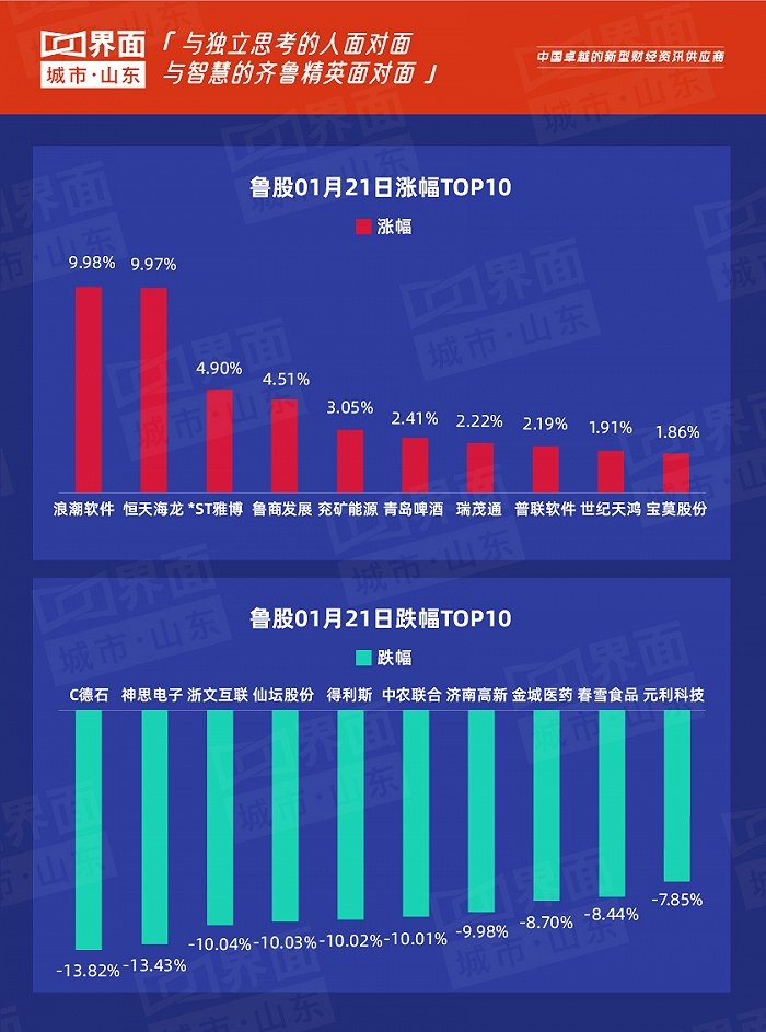 1月21日,山东64股上涨,8股持平,191股下跌。