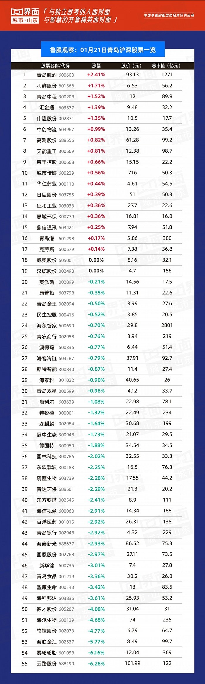 青岛市涨幅榜首:青岛啤酒(600600),涨幅2.41%,股价93.13元,总市值1271亿元;