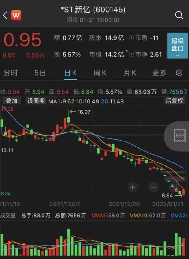 1月17日,上交所再次向*ST新亿发出监管工作函。截至目前,*ST新亿尚未聘请2021年年审会计师,该公司股票存在不能按期披露定期报告,被终止上市的风险。根据上交所有关规定,上市公司股票因2020年年度财务报告触及财务类退市指标,已被实施退市风险警示的,应当于2021年结束后1个月内进行业绩预告。上交所要求*ST新亿尽快聘请审计机构并积极配合按期对外披露年度报告,并按照上述要求做好业绩预告信息披露,并充分提示风险。