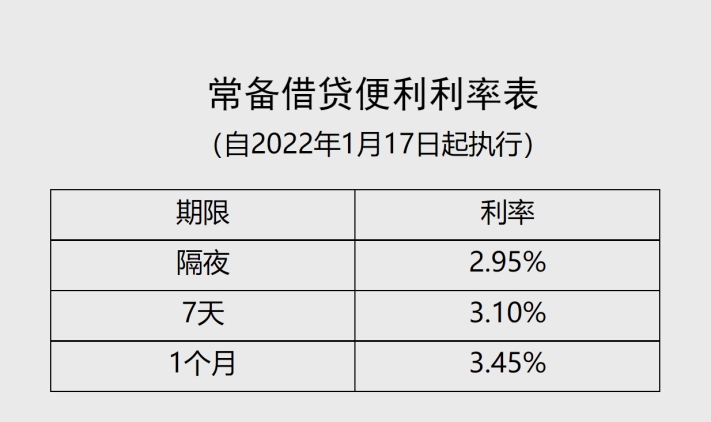 中国人民银行最新公布的常备借贷便利(SLF,俗称“酸辣粉”)利率表显示,自1月17日起,SLF利率隔夜品种为2.95%,7天期品种为3.10%,1个月期品种为3.45%。此前,隔夜、7天、1个月SLF利率分别为3.05%、3.2%、3.55%。