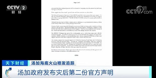 声明还说,汤加目前最大的挑战仍然是通信问题。部分地区恢复了有限的电话通信,部分地区建立了卫星和高频无线电通信。国际电话通信也部分恢复,电信运营商与政府通力协作,将努力修复全部服务。一艘船将于几天内抵达,计划对断开的海底光缆展开修复工作。