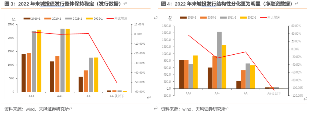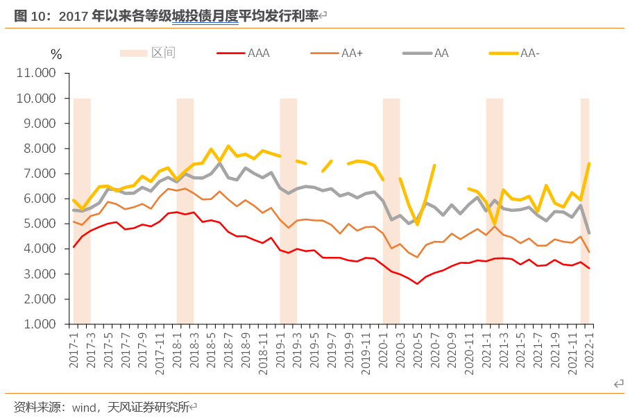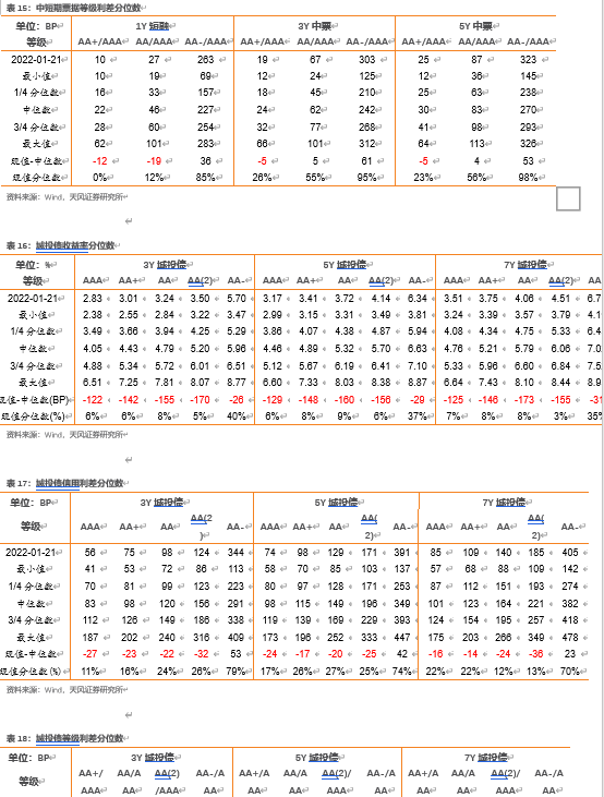 价的维度:2022年1月货币流动性环境较为宽松,AAA、AA+、AA城投债平均发行利率均有所降低,但AA-却表现出较大的分化,平均发行利率有所抬升,这是同过去三年同期发行上不同的地方。