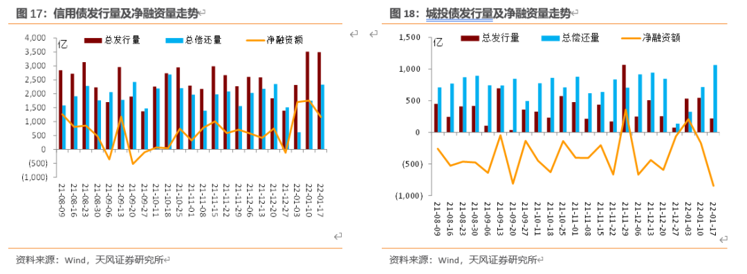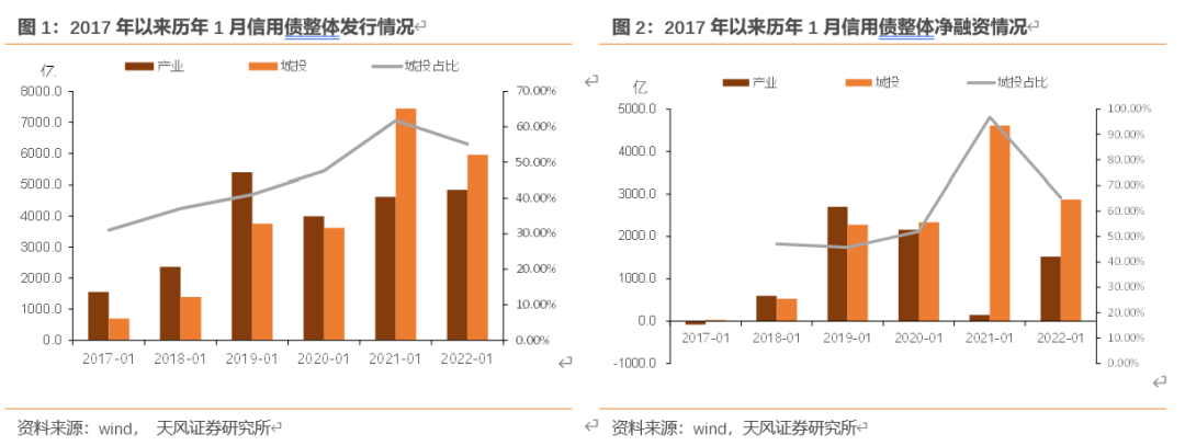 量的维度:2022年1月信用债整体发行和净融资,与2021年相比城投有所减少,产业有显著恢复,城投与产业的差距有所缩小。2021年初受永煤事件影响产业类主体发债较为困难,当月内净融资 96.8%是城投主体,而进入2022年,城投债净融资有所回落。
