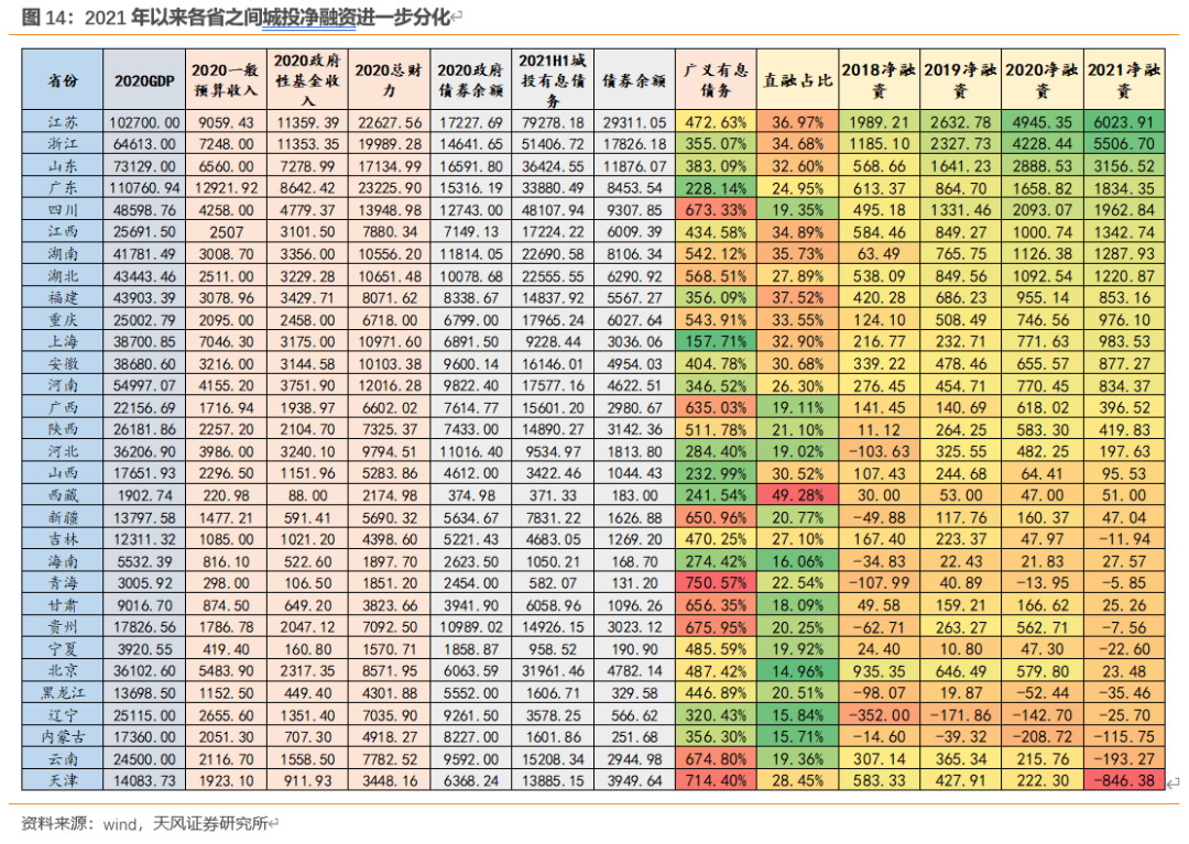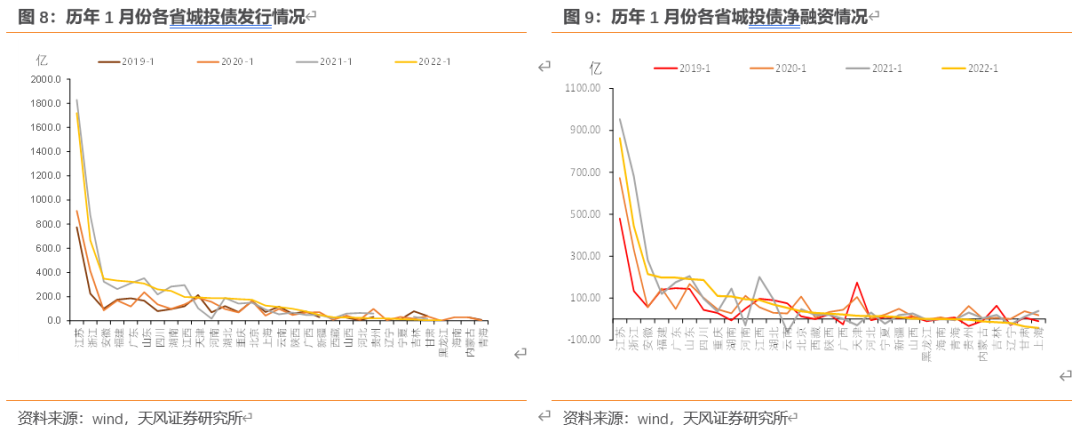 (1)天津、云南两省在压力较大的2021年净融资大幅下滑;