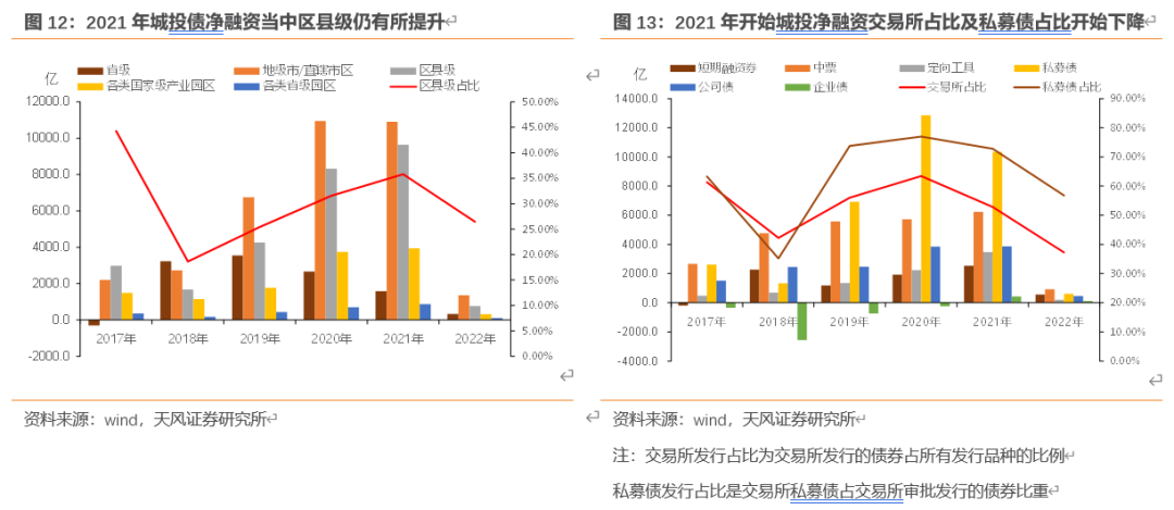 从发行场所上来看:政策引致到发行结果上则更为明显,2021年交易所发行占比以及交易所审批的城投债当中私募债占比均已有所下降。