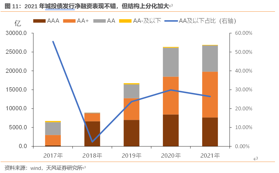 对于城投而言,2021年绝对是不平淡的一年,政策端全年都在呈现逐步收缩的态势,从交易商协会和交易所约束城投债发行,到银保监15号文,及进一步严查新增地方政府隐性债务问题及专项债使用的合规性等等,都呈现出压的一面,但受益于流动性的宽松且政策也有保的一面(并未限制还旧),以及市场面临的结构性资产荒,全年净融资表现还不错,基本与2020年持平,但从主体评级上来看,AA及以下占比有所下降。